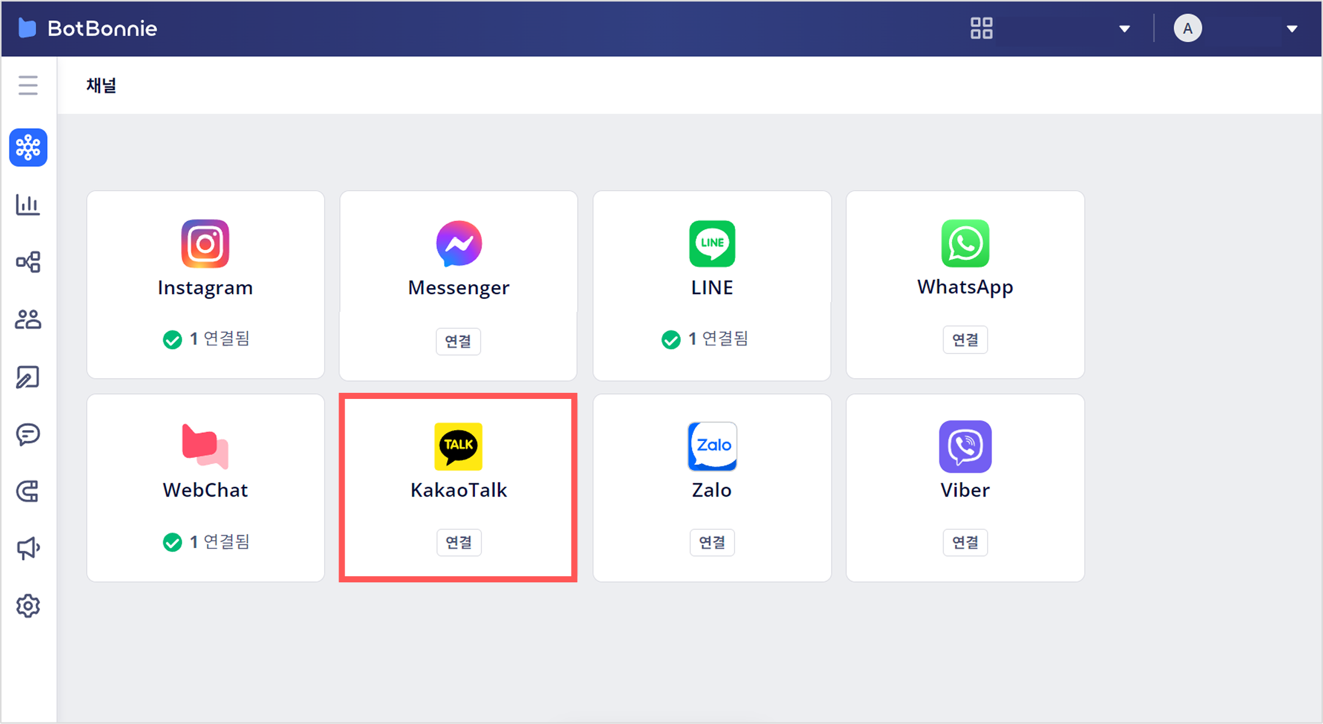 BotBonnie ํ์ด ์ฐ๋์ ์๋ฃํ๊ณ ๋๋ฉด BotBonnie ์ฝ์์์ ์ฐ๊ฒฐ๋ ์ฑ๋์ ํ์ธํ ์ ์์ต๋๋ค.