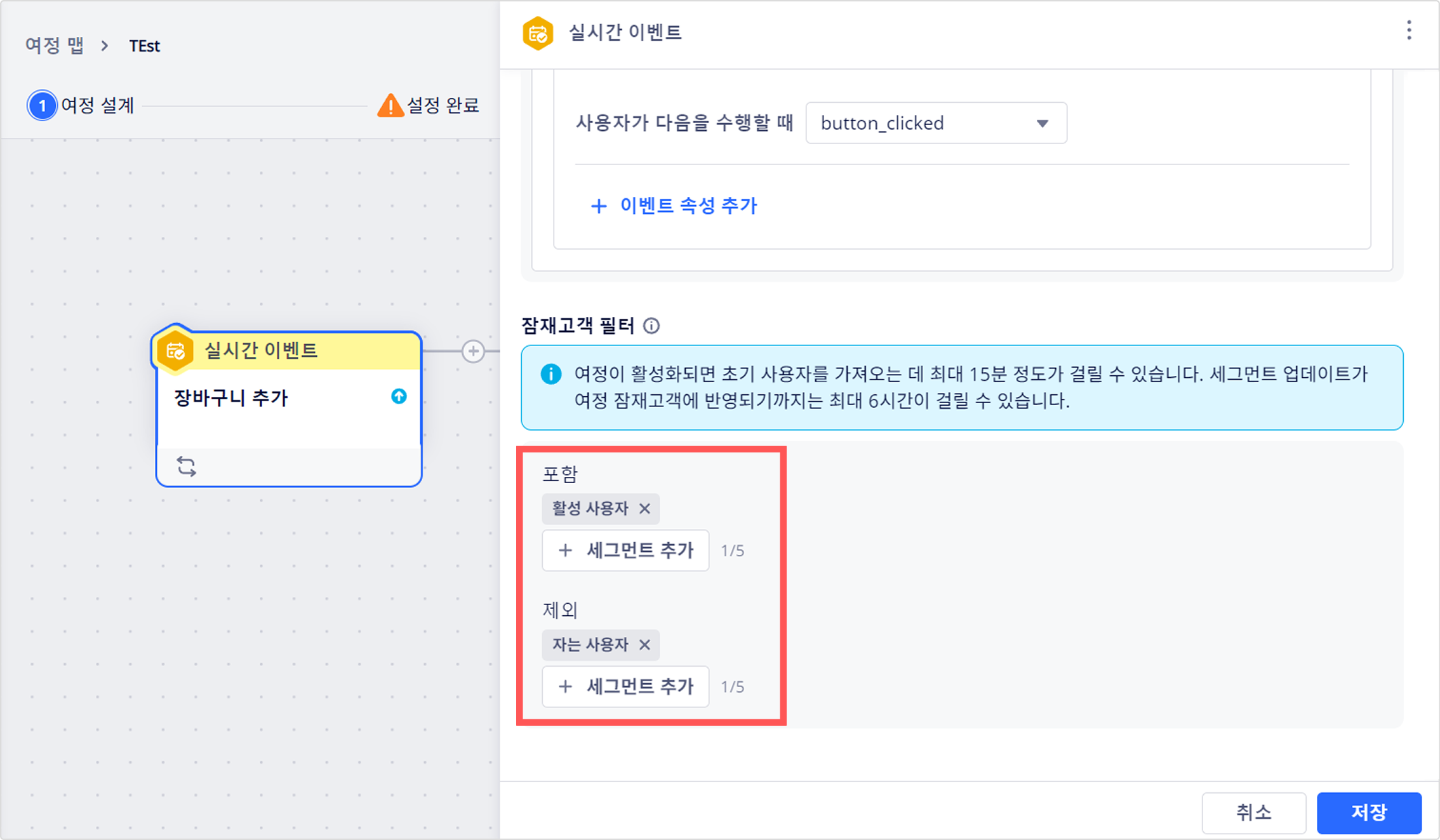 - 제외: 트리거 이벤트를 수행했더라도, 제외 세그먼트에 속한 사용자는 여정에 진입하지 않습니다.
