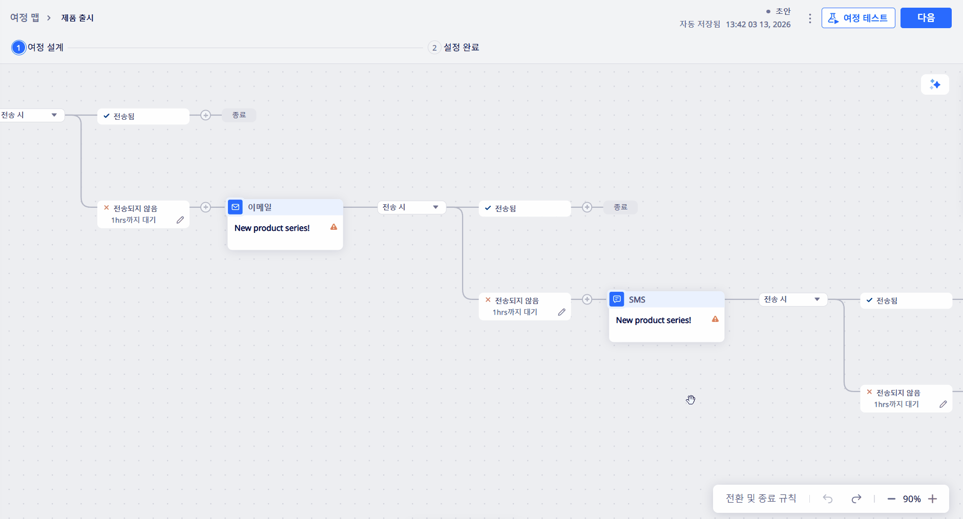 경로 병합 기능을 사용하면 메시지 노드에서 분리된 여러 경로를 다시 하나의 경로로 연결할 수 있습니다. 서로 다른 경로(예: 전송됨 또는 전송되지 않음)에 있던 사용자들을 공통된 다음 단계로 유도함으로써, 여정 맵을 간소화하고 중복 노드 생성을 방지할 수 있습니다.