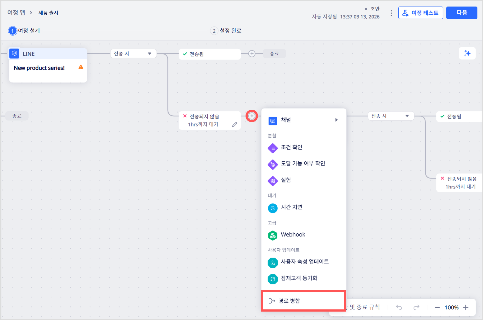 메시지 노드에서 갈라진 여러 경로를 다시 하나로 합칠 수 있습니다. 특정 경로만 골라서 합치거나, 모든 경로를 한 번에 합치는 것도 가능합니다.