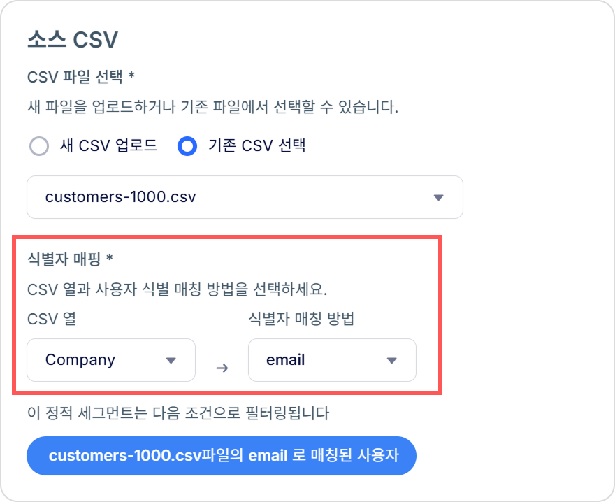 기존 사용자와 매핑할 수 있는 ID가 포함된 CSV 파일을 업로드하여 세그먼트를 생성하세요.