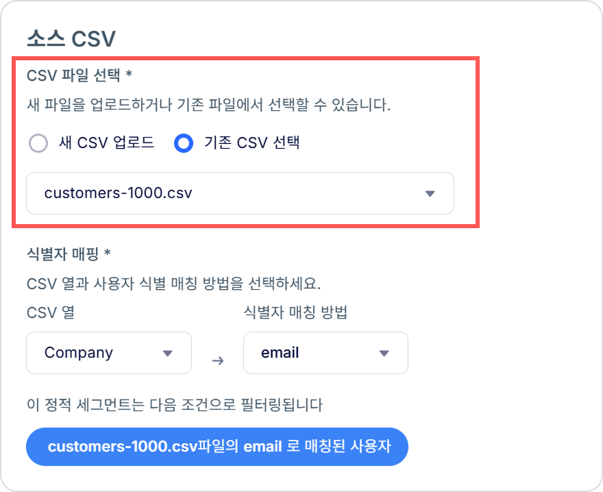 소스 CSV 아래에서, 새 사용자 파일을 업로드하거나 기존 파일을 선택하세요. CSV 파일 용량은 최대 50MB까지 가능합니다.