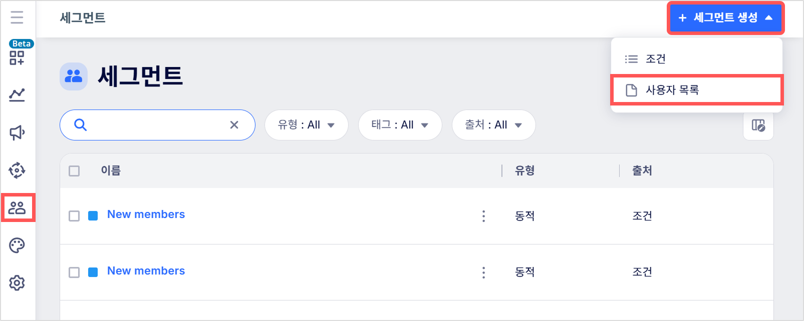 사용자 속성과 이벤트 조건을 사용해 세그먼트를 만들려면, 세그먼트 메뉴로 이동한 다음 + 세그먼트 생성 > 사용자 목록을 클릭하세요.