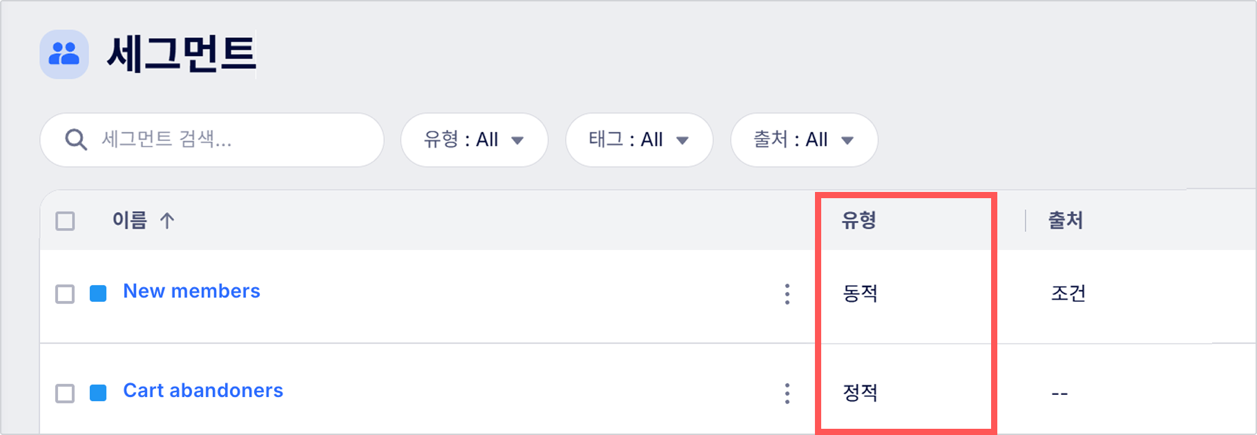 세그먼트가 자동으로 업데이트되는지 여부는 세그먼트 유형에 따라 결정되며, 세그먼트 소스를 통해 해당 세그먼트가 어떤 방식으로 만들어졌는지 확인할 수 있습니다. 두 개의 요소 모두 세그먼트가 어떻게 그리고 언제 업데이트되는지 결정합니다.