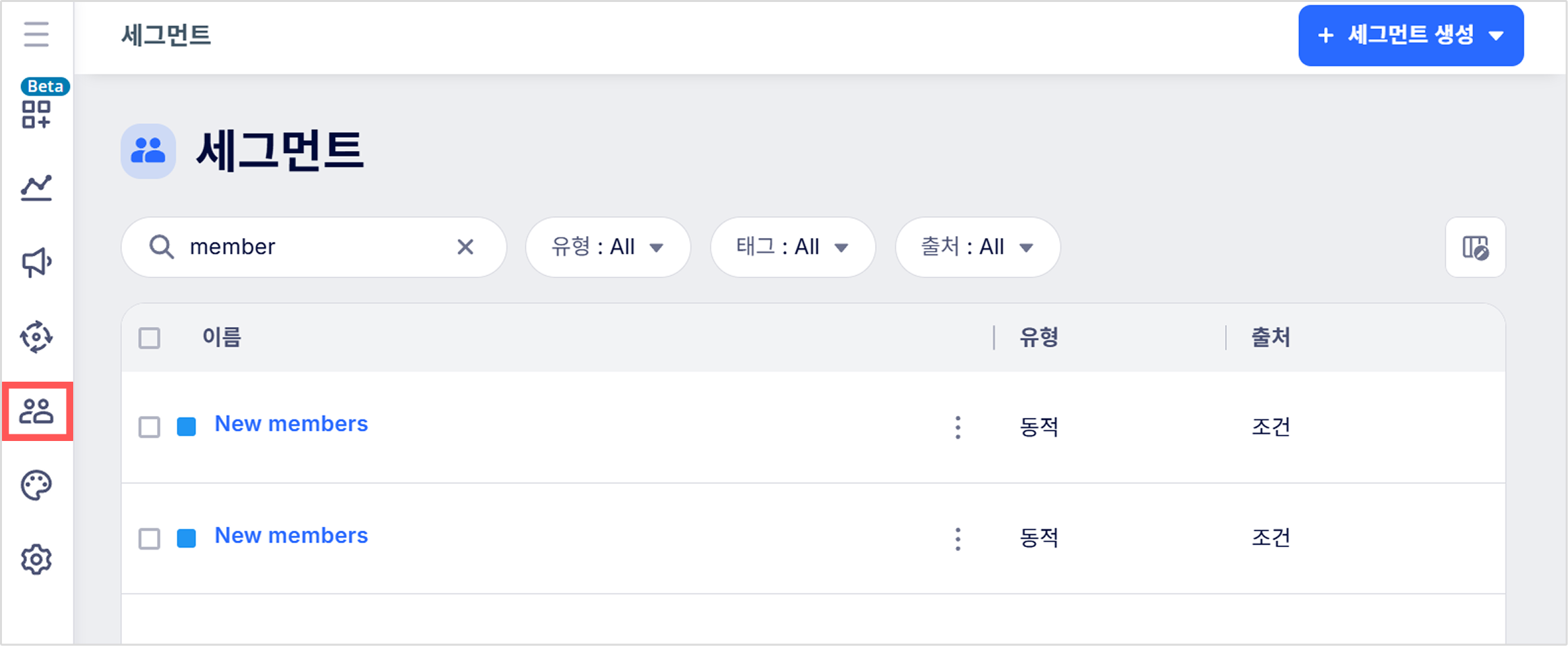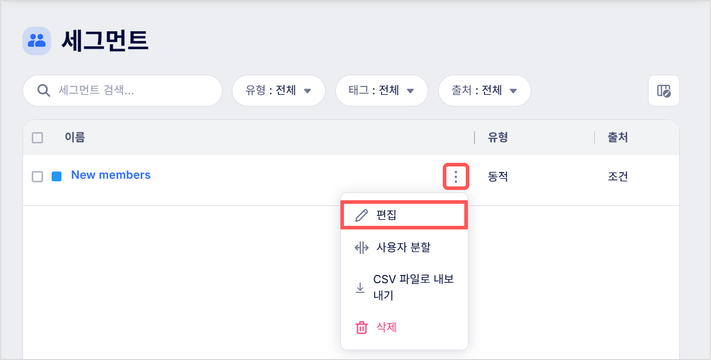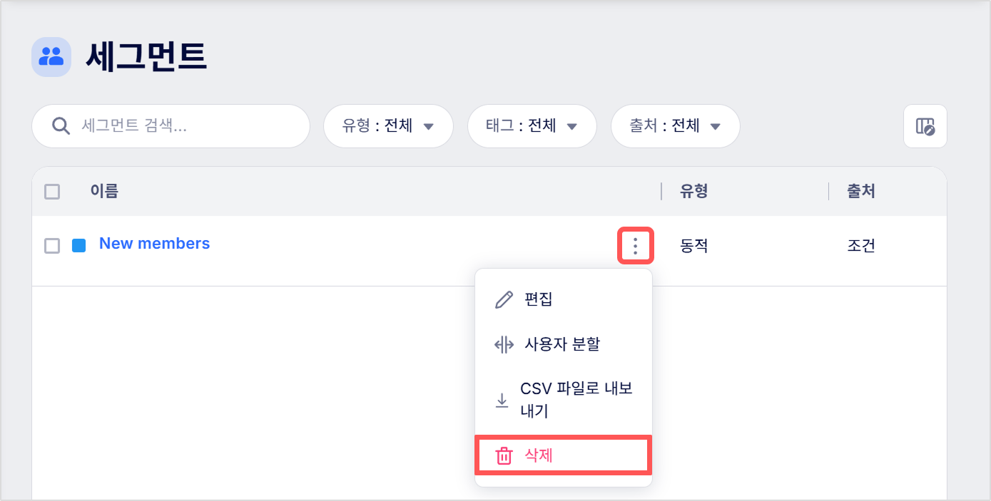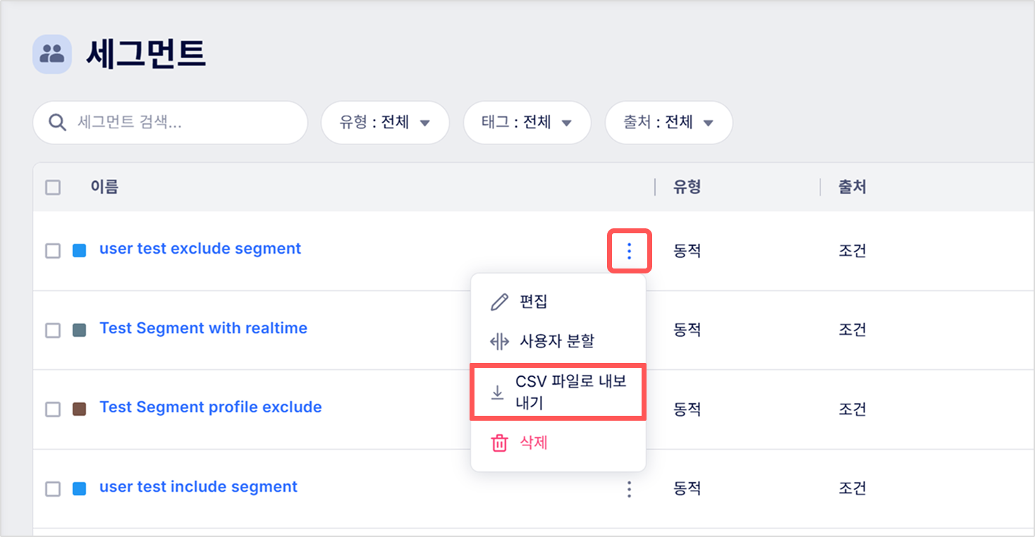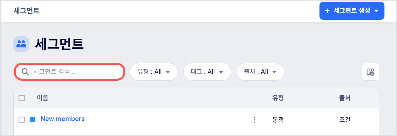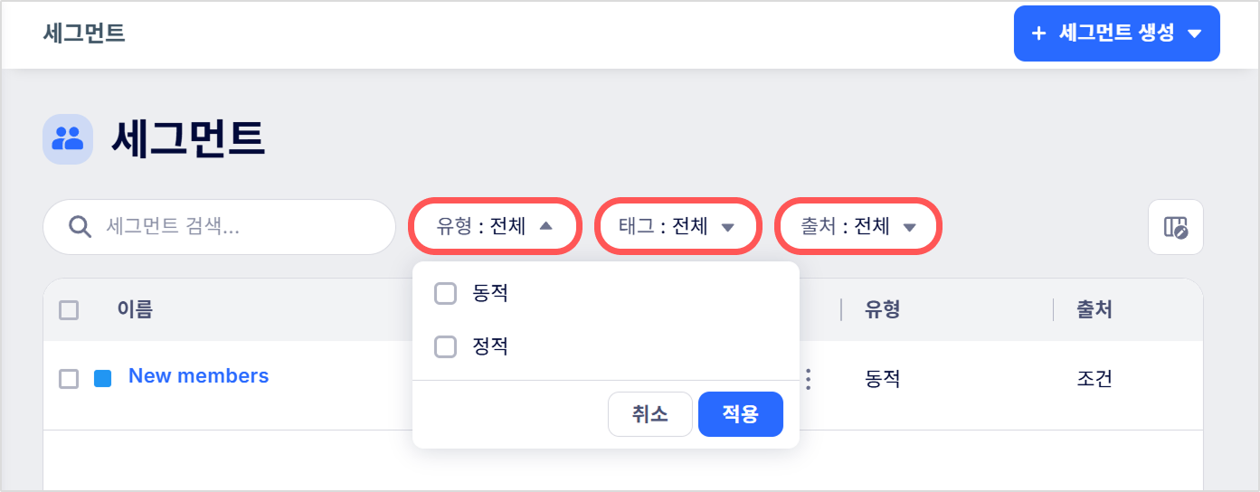 필터링 드롭다운 메뉴를 사용하여 세그먼트 유형, 태그, 출처별로 목록 결과를 더 상세하게 필터링할 수 있습니다.