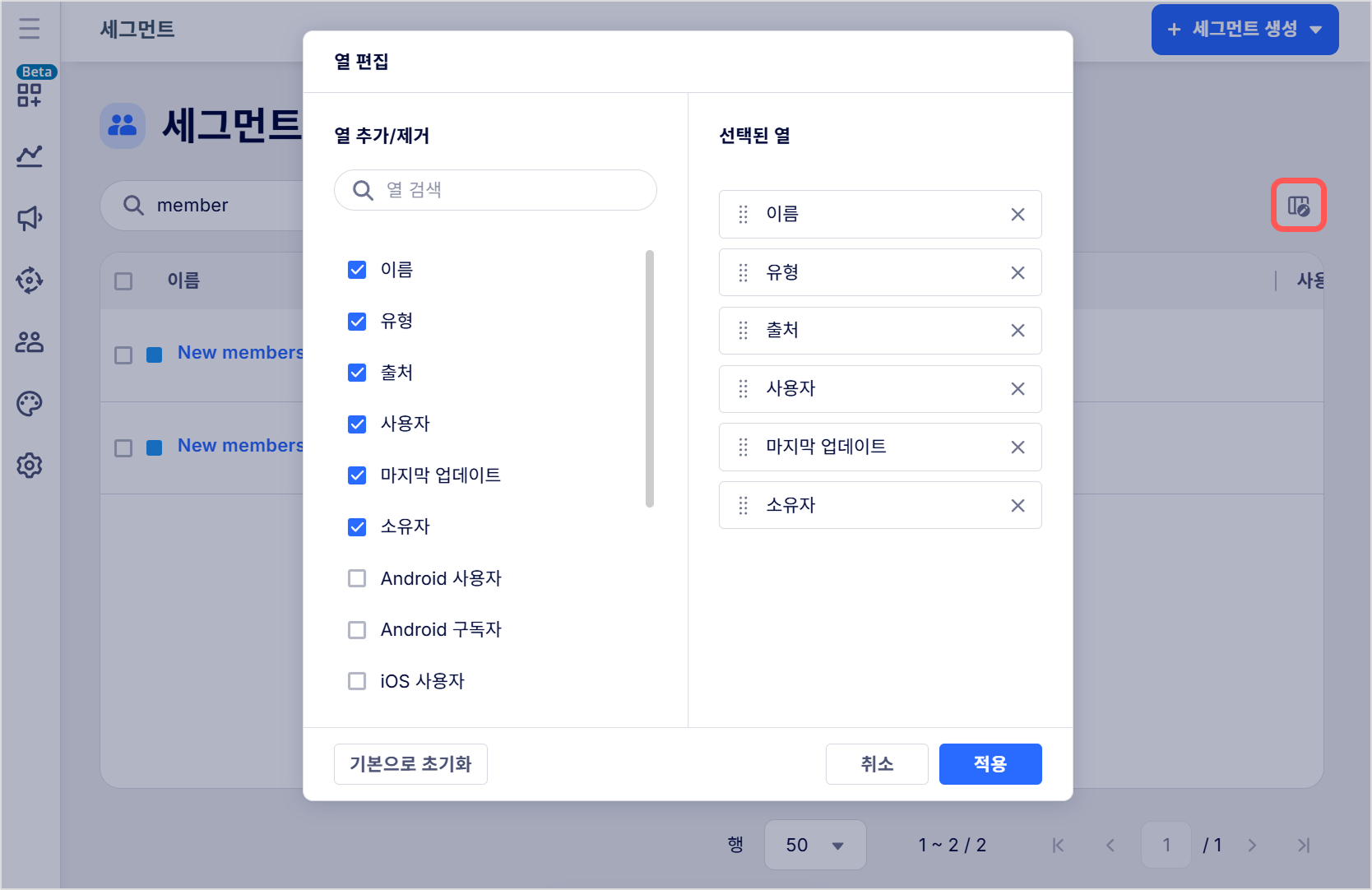 - 또한, 세그먼트 목록 열을 커스터마이즈하여 나에게 꼭 필요한 정보만 골라 볼 수 있도록 화면을 구성해 보세요.